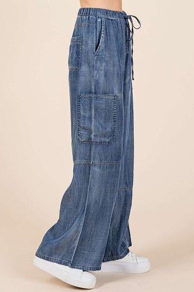Mittoshop Washed Elastic Waist Cargo Wide Leg Pants for Women