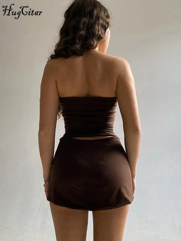 Hugcitar Solid Sleeveless Folds Tube Crop Top Skirts 2 Piece Matching Set Summer Fashion Streetwear Beach Clothing Drop Shipping
